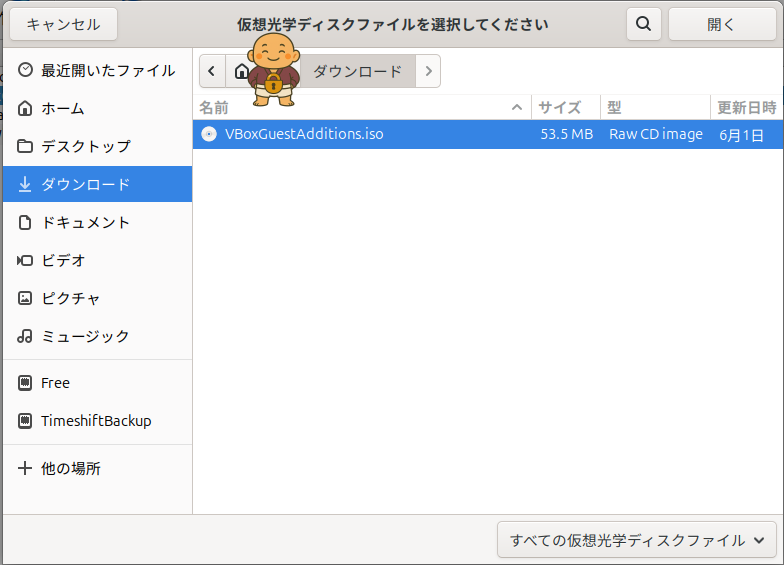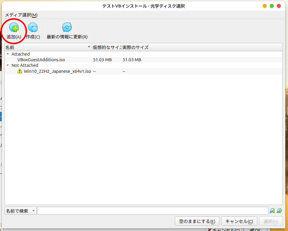 「追加」を選択し、VBインストール時に、同時に自動ダウンロードされている、【Guest Additions.iso】を選択します。
