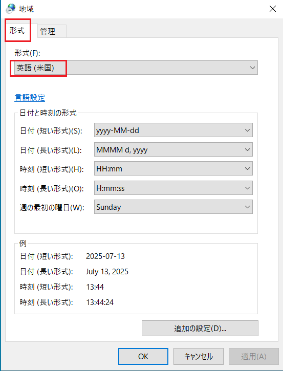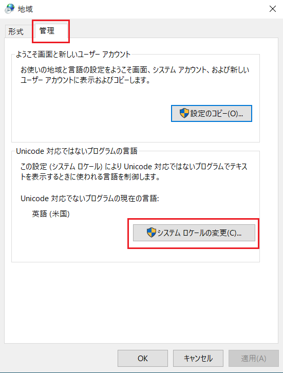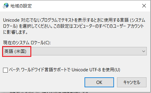 5.システムロケールを『日本』→『英語(米国)』に変更。
